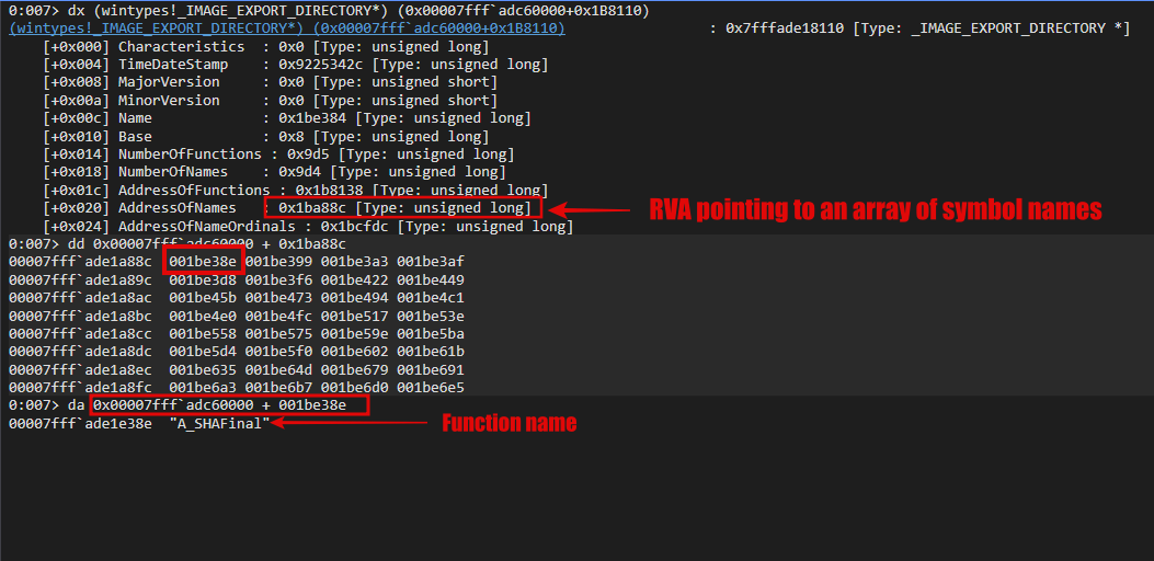 In this context, the most important members for us are AddressOfNames, AddressOfFunctions, NumberOfNames, AddressOfNameOrdinals.