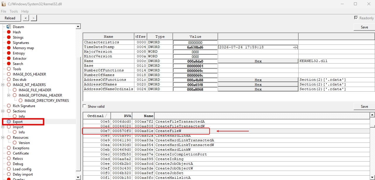 At this point, we know that a PE file loads modules into memory. The next step is to enumerate the exported functions provided by a DLL, if any exist. These functions are described in the Export Table of the PE file. In practice, a PE file maps DLLs into its virtual address space in order to import and invoke functions exported by them. For example, to call the CreateFileW API, the process must first load KERNEL32.DLL into its address space.