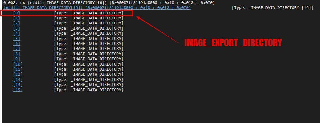 As mentioned earlier, the data directory is an array of IMAGE_DATA_DIRECTORY structures, which contain 16 entries. The first entry (index 0) corresponds to the export table. Each member of this array holds the RVA of a critical structure, such as the export table or the import table.
