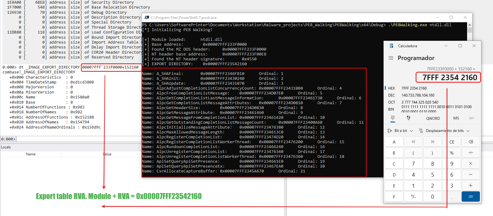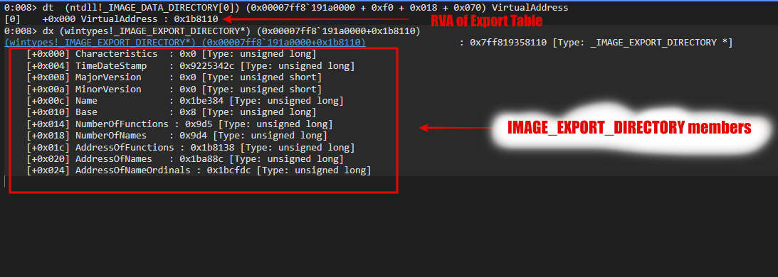 To resolve the export table’s location, the first step is to obtain its RVA from the data directory and add it to the module’s base address. Although this is trivial in WinDbg or with third-party tools, the process differs when implementing it programmatically.