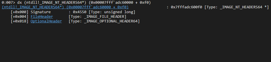 From the DOS header, we add the e_lfanew offset to the module’s base address (e.g., ntdll.dll, KERNEL32.DLL) to locate the NT headers, which are represented by the IMAGE_NT_HEADERS structure. At this stage, the member of interest is OptionalHeader, which is defined by the IMAGE_OPTIONAL_HEADER64 structure.