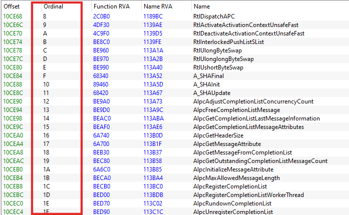 In the above screenshot, I’m using an kernel32.dll file as an example. At the time of writing this post, there are 1,692 entries. The export table is a data structure IMAGE_EXPORT_DIRECTORY, and it’s found in the first array member of Data Directory, that is, 0 member. The Data Directory it’s an array data structure _IMAGE_DATA_DIRECTORY and has 16 members.